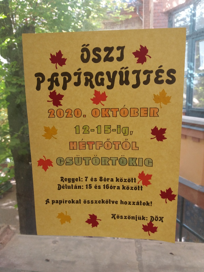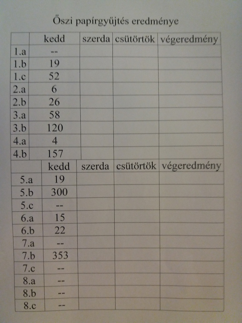 Ezen a hten cstrtk dlutnig paprgyjts van az iskolnkban. Eddig 157 kg-mal mi vezetnk az alssok kztt.
